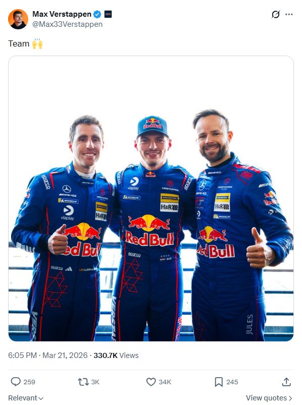 维斯塔潘更新社交媒体:团队🙌