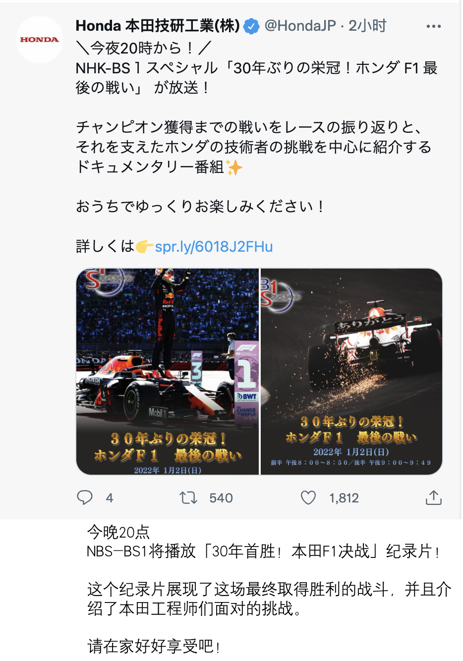 据本田Twitter发布的消息,今晚日本时间20:00(北京时间19:00),日本NHK-BS1台将播出红牛-本田车队在F1夺得车手总冠军的特别纪录片。