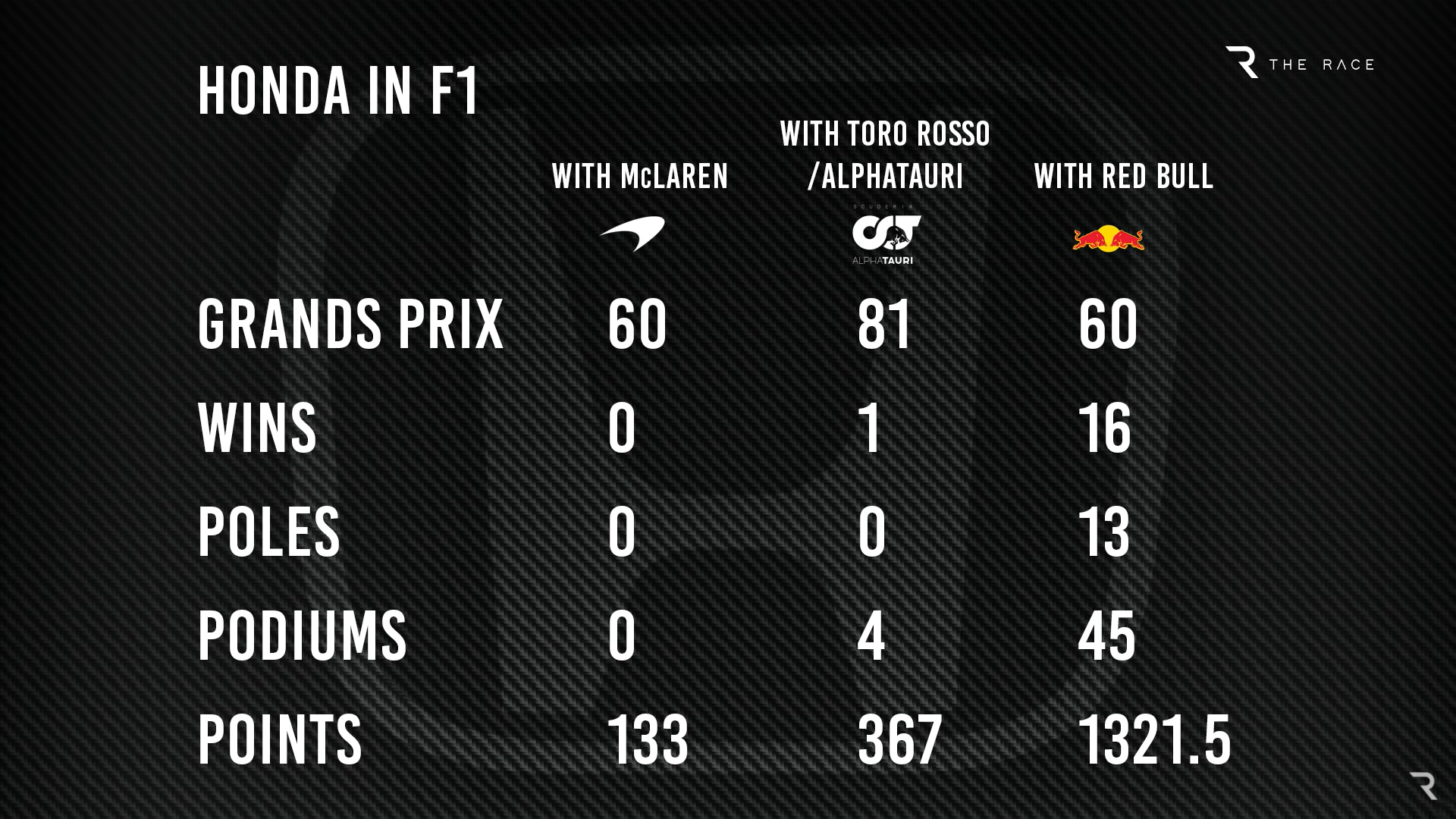 最终在红牛车队的合作,才是当初与迈凯伦车队合作时的愿景,在同样60场比赛中,红牛共赢得16场分站赛冠军、13次杆位发车。共计45次领奖台完赛。