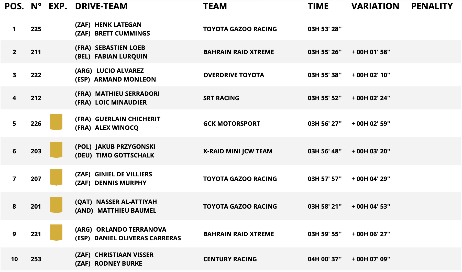 今天结束的达喀尔第五赛段汽车组的比赛中,拉特甘最终取得第一,驾驶奥迪纯电动赛车的勒布排名第二,阿尔瓦雷斯落后2分10秒排在第三位。