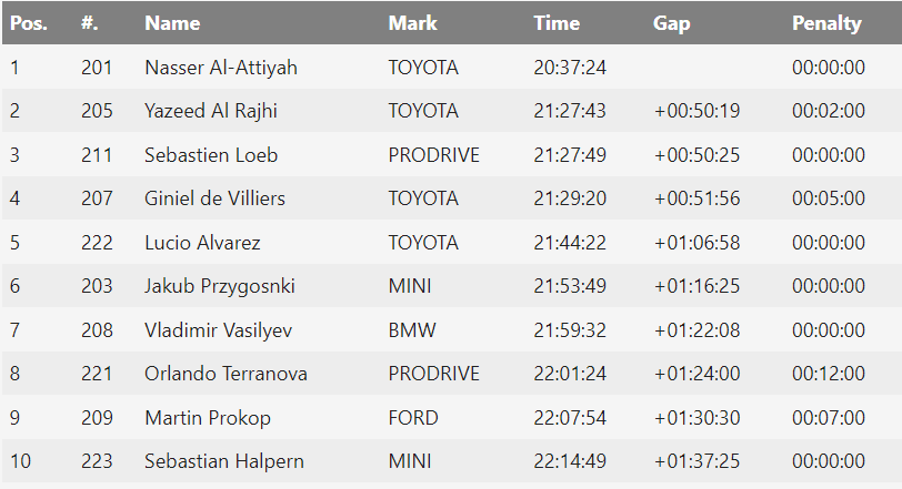 达喀尔拉力赛赛场,丰田车队成功对德维利尔斯受到的5小时判罚提出上诉,目前,赛会已经撤销了罚时,德维利尔斯回到了总成绩第4位。