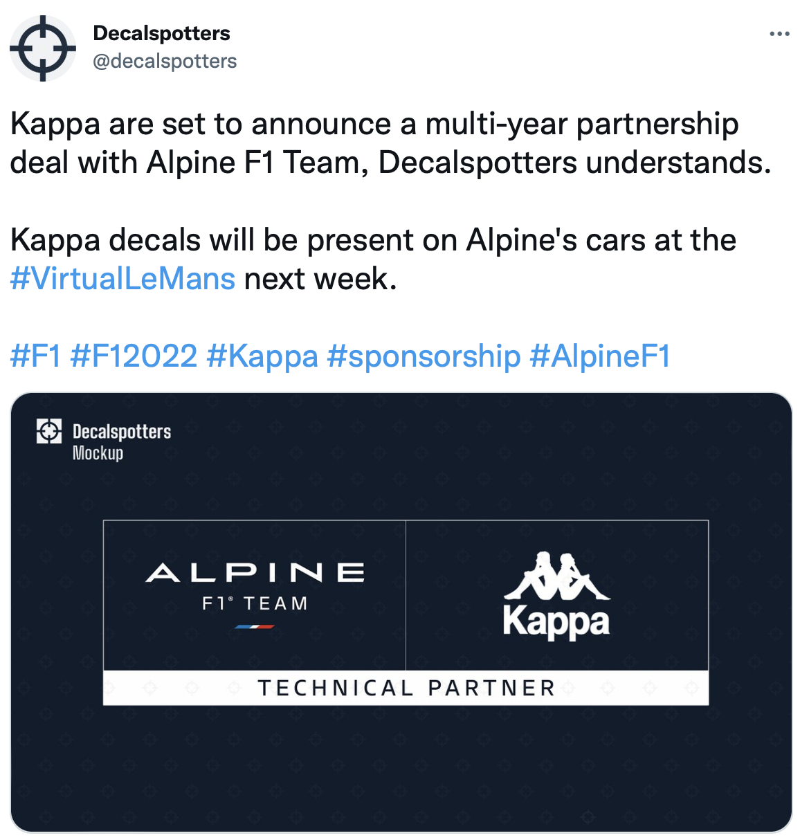 据Decalspotters报道,Alpine车队将与著名运动品牌Kappa达成多年合作协议。即将进行的线上勒芒24小时耐力赛中,Kappa的商标也会出现在Alpine的赛车上,感兴趣的小伙伴可以留意一下。