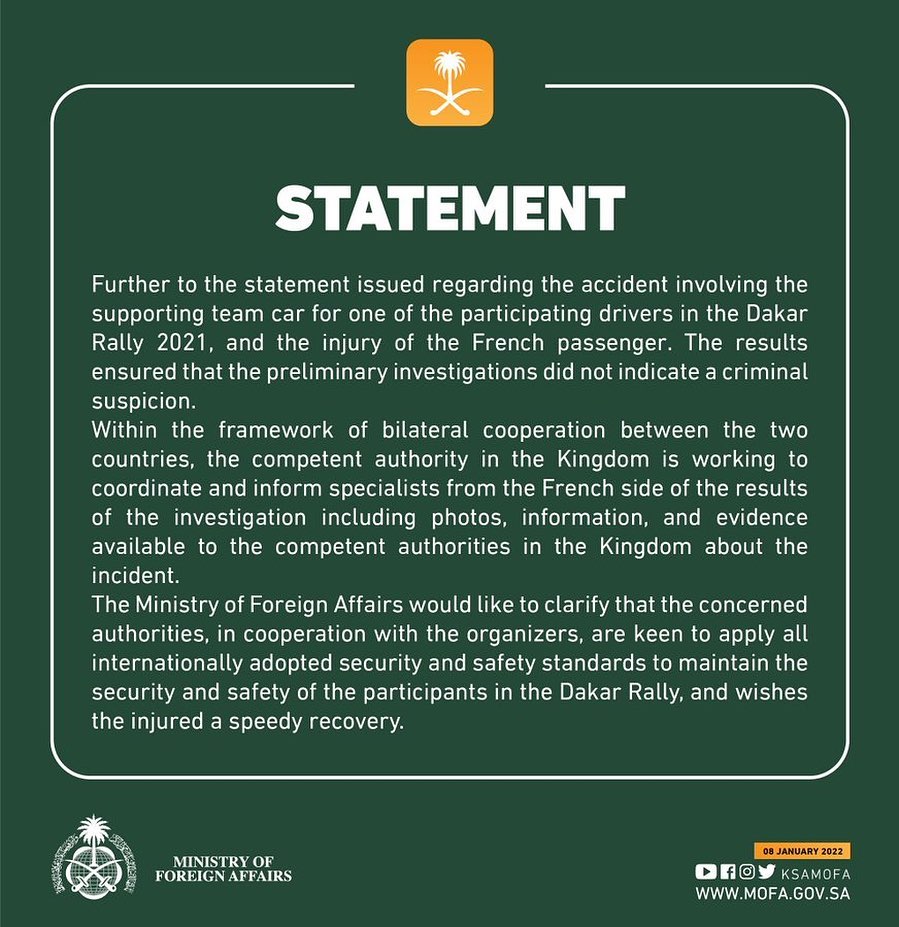 沙特外交部督促办赛各方加强安全监管,并祝愿受伤车手早日康复。