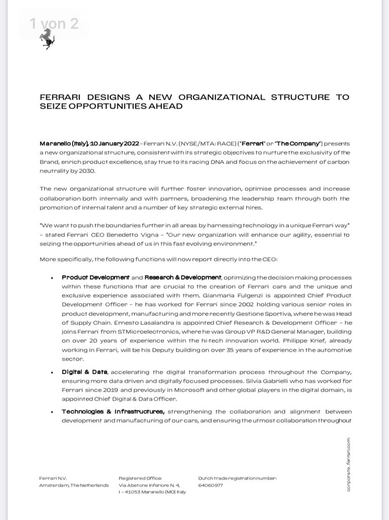 在新CEO Benedetto Vigna的领导下,法拉利对公司的产品研发、数据、科技&基础设施、采购&质量、生产和审计几个部分进行了规划。