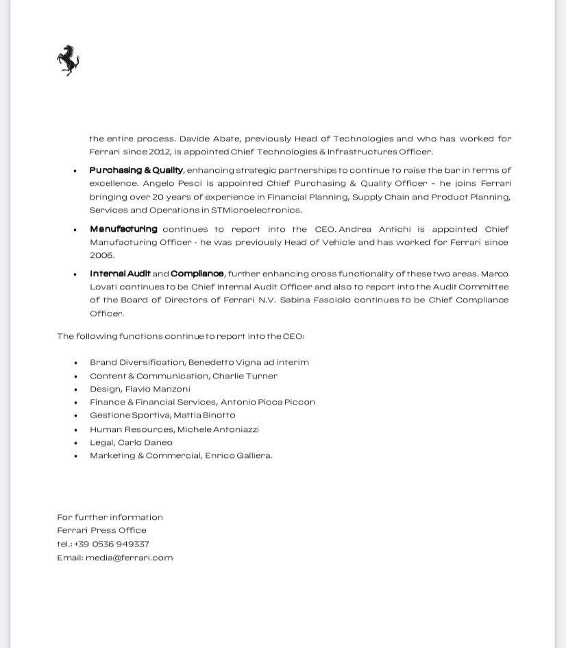 其中,法拉利现领队马蒂亚·比诺托任职于赛车公司,并直接向CEO报告。