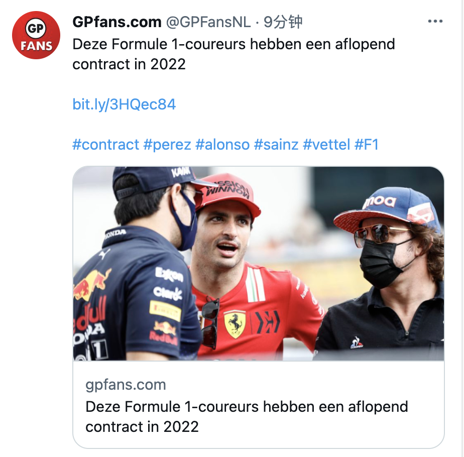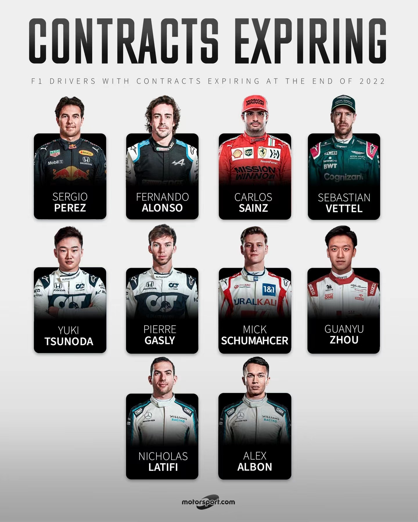 合同将在年底到期的车手包括:红牛车队的佩雷兹、Alpine车队的阿隆索、法拉利车队的塞恩斯、阿斯顿马丁的维特尔、红牛二队的角田裕毅和加斯利、哈斯车队的米克·舒马赫、阿尔法·罗密欧的周冠宇,以及威廉姆斯的拉提菲和阿尔本。