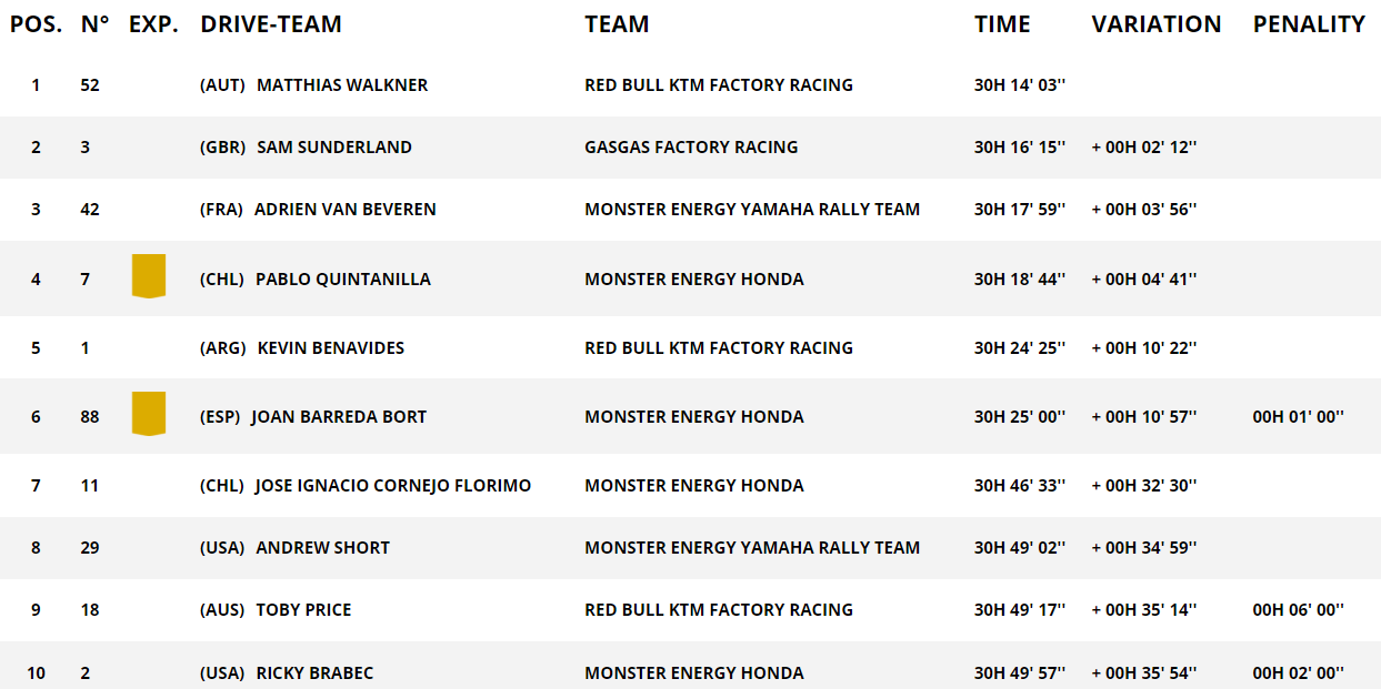 第九赛段虽然没有出现太多意外,但率先开路的GasGas车手桑德兰仍然损失了8分钟,只排在赛段第14。表现非常稳定的KTM车手沃克纳在过去四个赛段三次获得前四的好成绩,而今天的赛段第四也让沃克纳超越了桑德兰,来到了总成绩榜领先的位置。