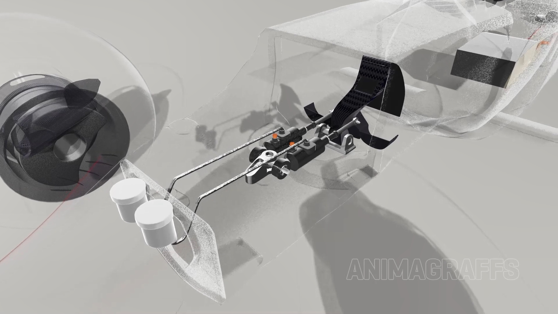 它由两个油液系统组成,车手踩下刹车后两个系统同时推动,油液推动刹车卡钳里的活塞抱住碳纤维复合材料的刹车盘,进行制动。