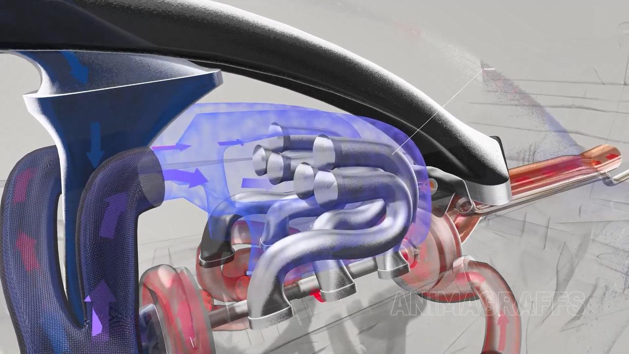 从车手上方进气口通过Ram effect进来的空气经过气道增大压力增加再经过压缩机增压后因为热力学原因被强制加热了,所以要经过车辆左侧巨大的中冷器(Intercooler)降温后才能去往引擎,中冷器从车的侧进风口吸取冷气降温。经过中冷器的空气进入稳压气箱后分缸体被导入各个气缸进行燃烧。