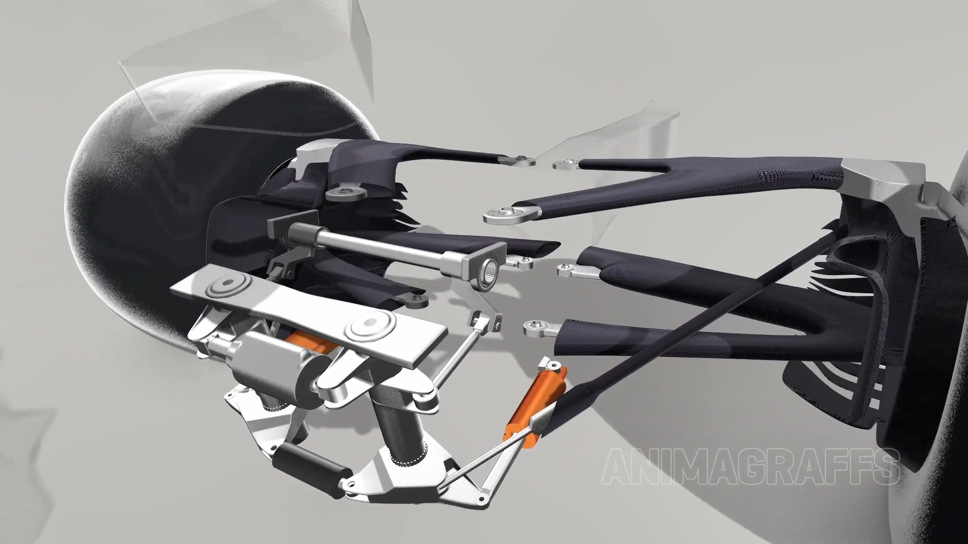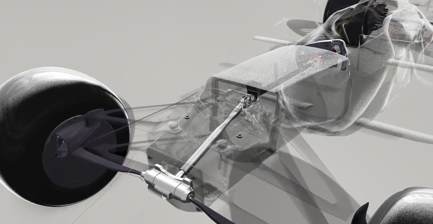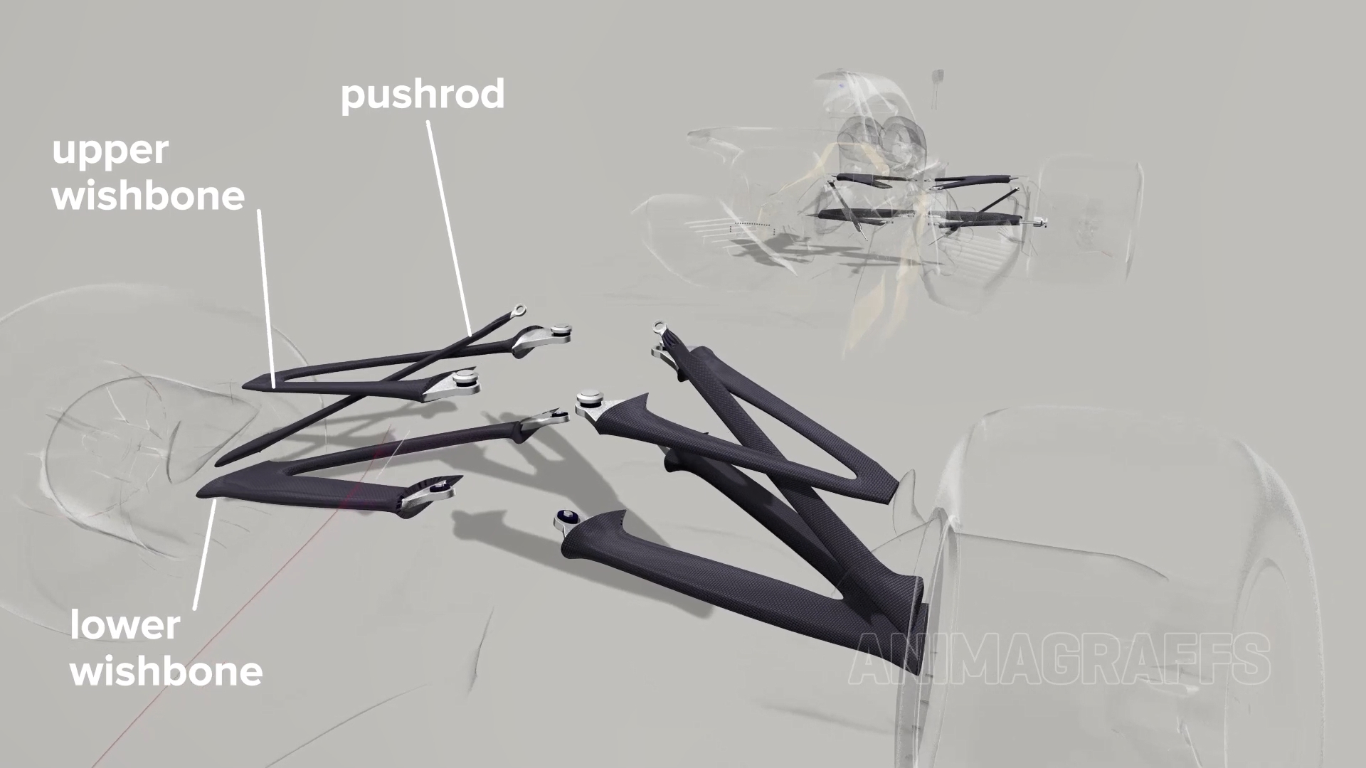 F1赛车用着我们熟知的双A控制臂(wishbone)在前后控制着四个车轮的运动。