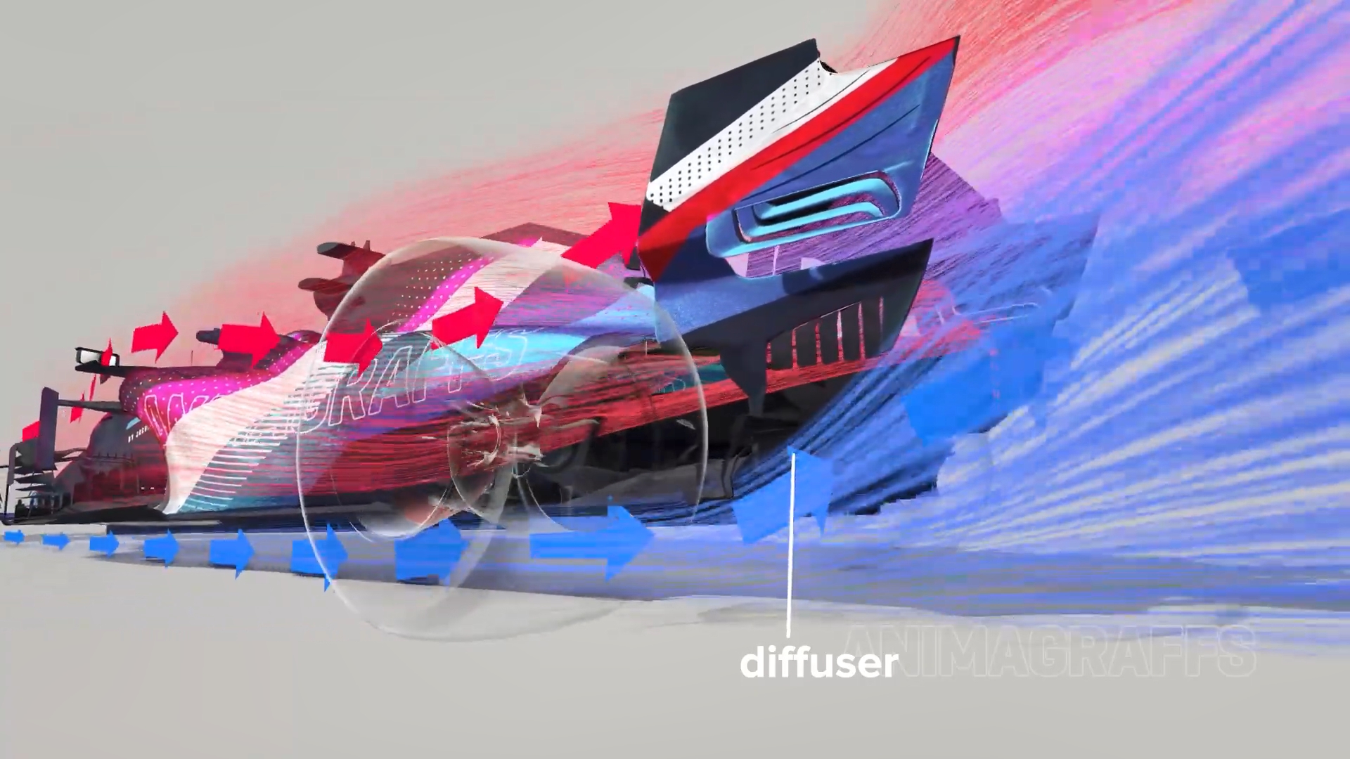 刚才说到底部气流,底部气流流动更顺畅,流速更快,再经过尾部扩散器的作用,会造成底部压力非常低,这产生了车身整体下压力的最大部分。