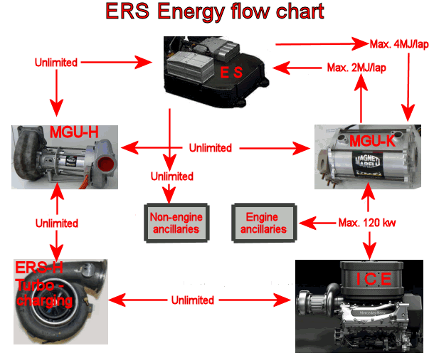 同时它在刚出弯需要涡轮达到需要转速的时候输出让涡轮到达设定的增压值保证车辆及时的动力响应。MGU-K,MGU-H,ICE,电池共同组成了我们知道的ERS系统,Energy Recovery System。