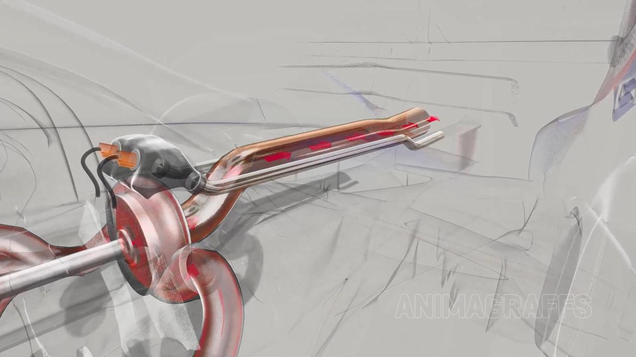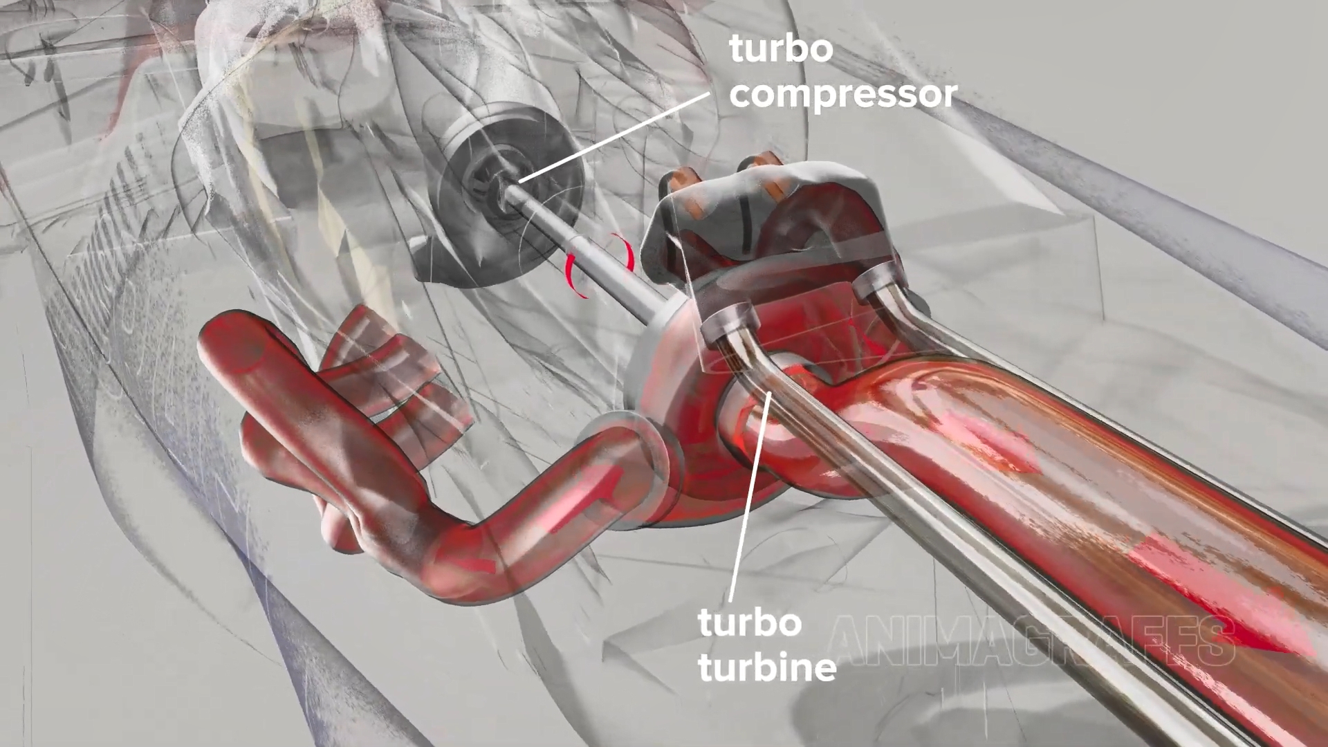 经过内燃机(ICE,Internal Combustion Engine)的燃烧后,流入刚才提到的涡轮中然后从排气管中排出,排气管两侧有废气旁通管,负责疏导过量通往涡轮本体的废气。