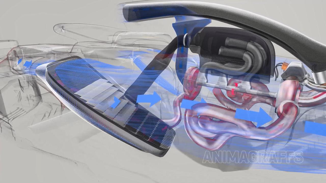 它负责三项,电池系统冷却,机油系统冷却和内燃机的水路冷却。后方还有一个小型散热器,图中的三角形,负责液压系统,变速箱,和ERS系统的散热。这就是F1赛车散热主要系统的构成。
