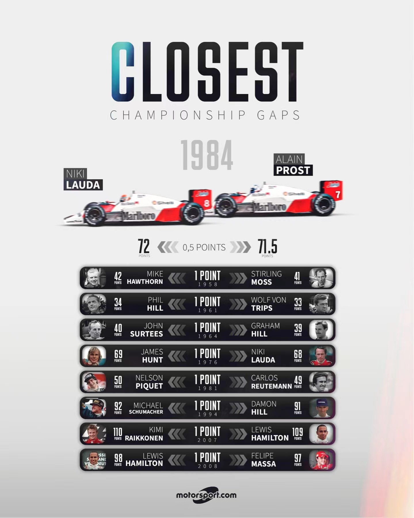 历史上最接近的9次F1冠亚军之争,分差全部都不超过1分。