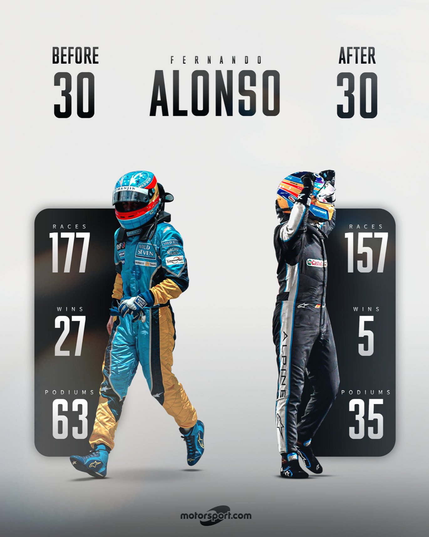 据Motorsport的统计,阿隆索30岁之前共参加过177场比赛,并取得了27胜63个领奖台的成绩。而30岁之后至今,他一共参加了157场比赛,获得了5场胜利和35个领奖台。