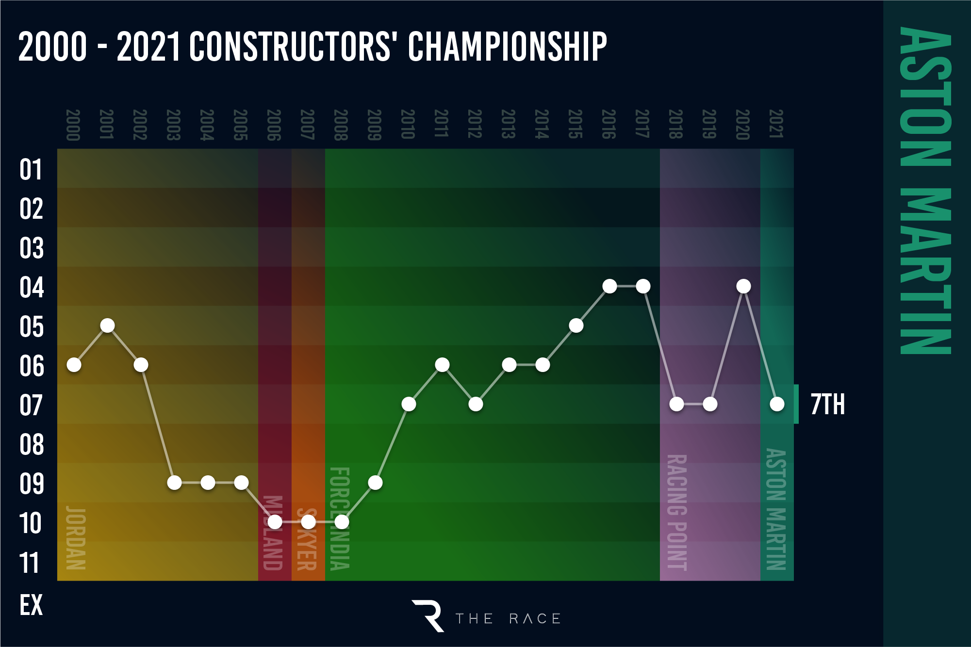 来到2021赛季,人们将更高的期望值寄托于阿斯顿马丁,而结果却是一场灾难。作为经典奢华的英伦跑车品牌,他们在F1的首个赛季成绩就以断崖式下跌。这就是因为他们上个赛季抄袭了梅赛德斯的思路,结果在规则修改之后吃了大亏。梅赛德斯方面,因为拥有雄厚的资源可以及时做出修正,而阿斯顿马丁却还是小规模的车队水平,无法有效解决问题。