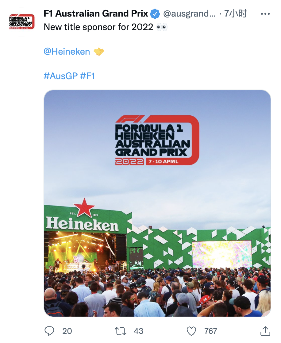 F1澳大利亚站在自己的官方社交平台宣布,喜力啤酒将成为赛事的冠名赞助商。