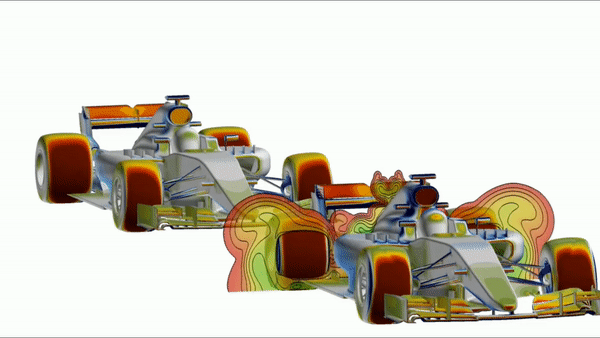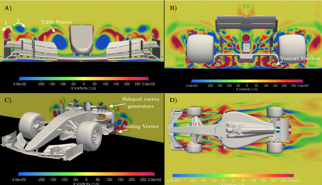 前翼经过的气流一部分会流经车身最后到尾翼,分离情况取决于车身中部的设计。流向车轮后形成的乱流又依赖车轮和刹车区对应的气流设计。同时经过散热器的气流还有下方底板来的气流都会在尾部交织,这又是一个复杂的叠加问题。端板产生的涡流,前翼产生的涡流封锁住了高能空气,都是互相影响的。
