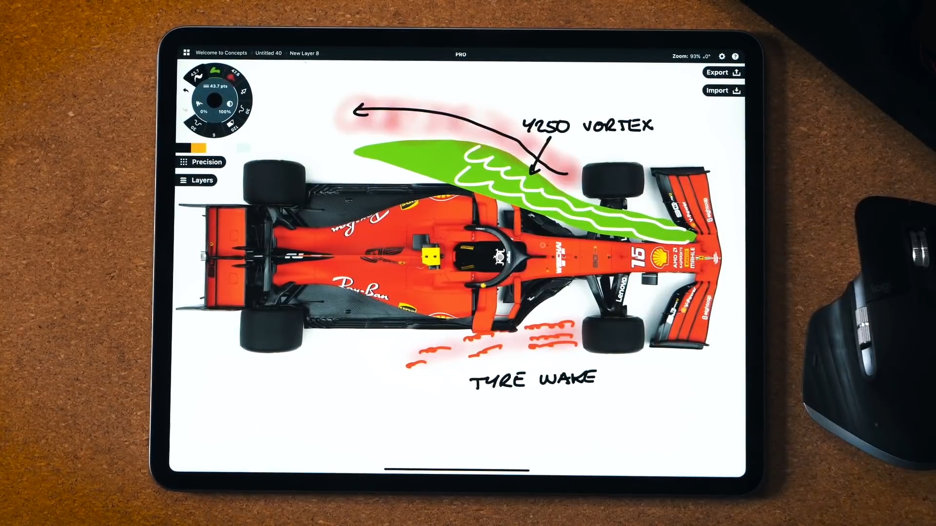 因为规则规定这些边缘必须在y轴250mm处,Y250涡流从车中部从鼻尖和堆叠的前翼片中间流过。车队优化控制这个涡流,因为他能导向前底板有很大气动优势,它也可以帮助后翼建立下压力。