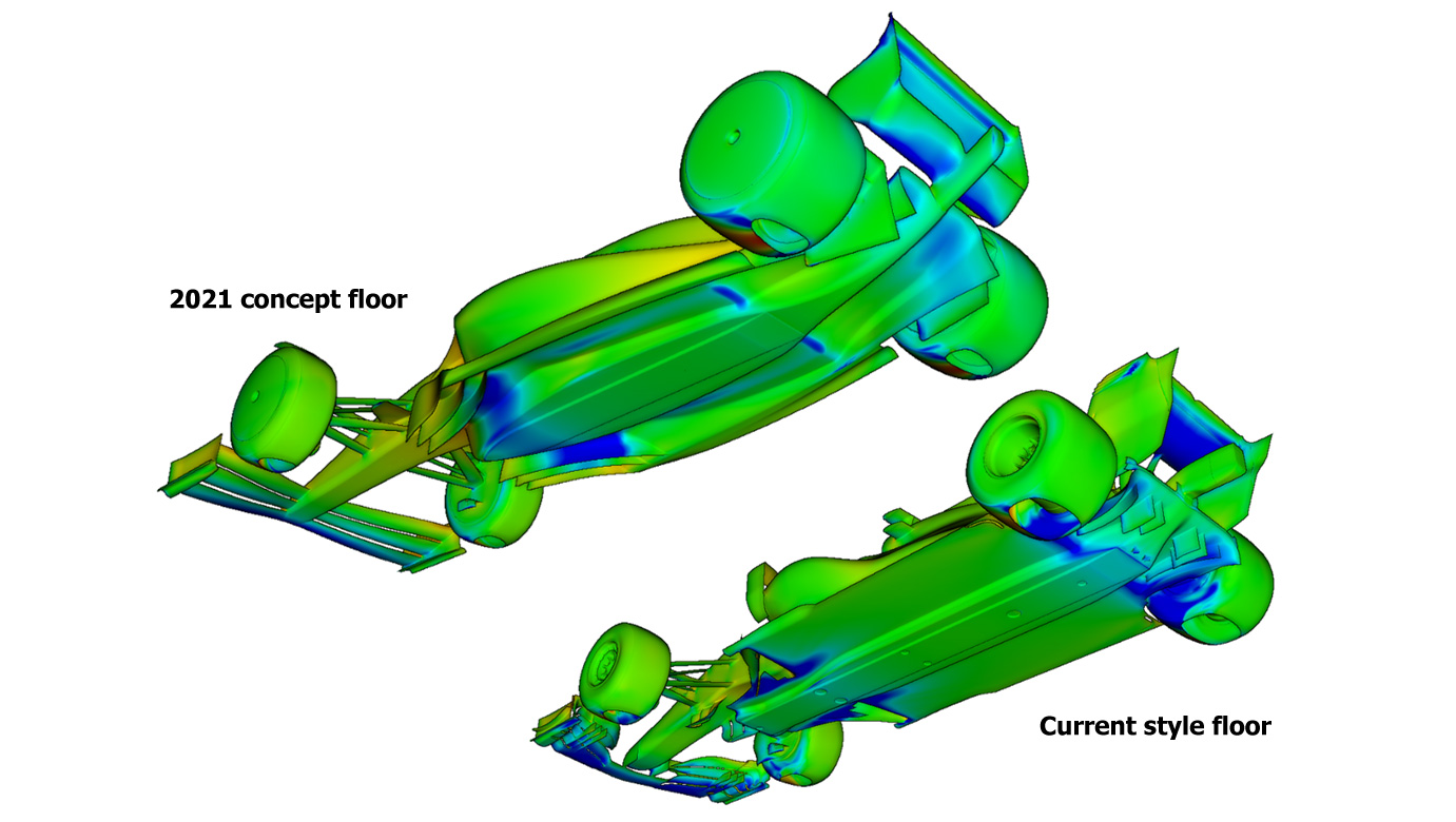 但是从平直的底板换到拥有大流道的底板,再配合上其他一切部件,工程师依然可以通过设计和实验打造出一台下压力并没有显著落后的车。