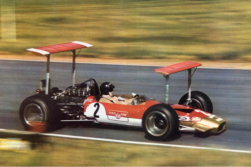 似乎第一个图中莲花49型,除了本来的前翼还多了一个上方的前翼,后面还带一个全场最宽的尾翼,配上扁平的低阻力车身应该是阻力小且下压力大的完美配置了吧?