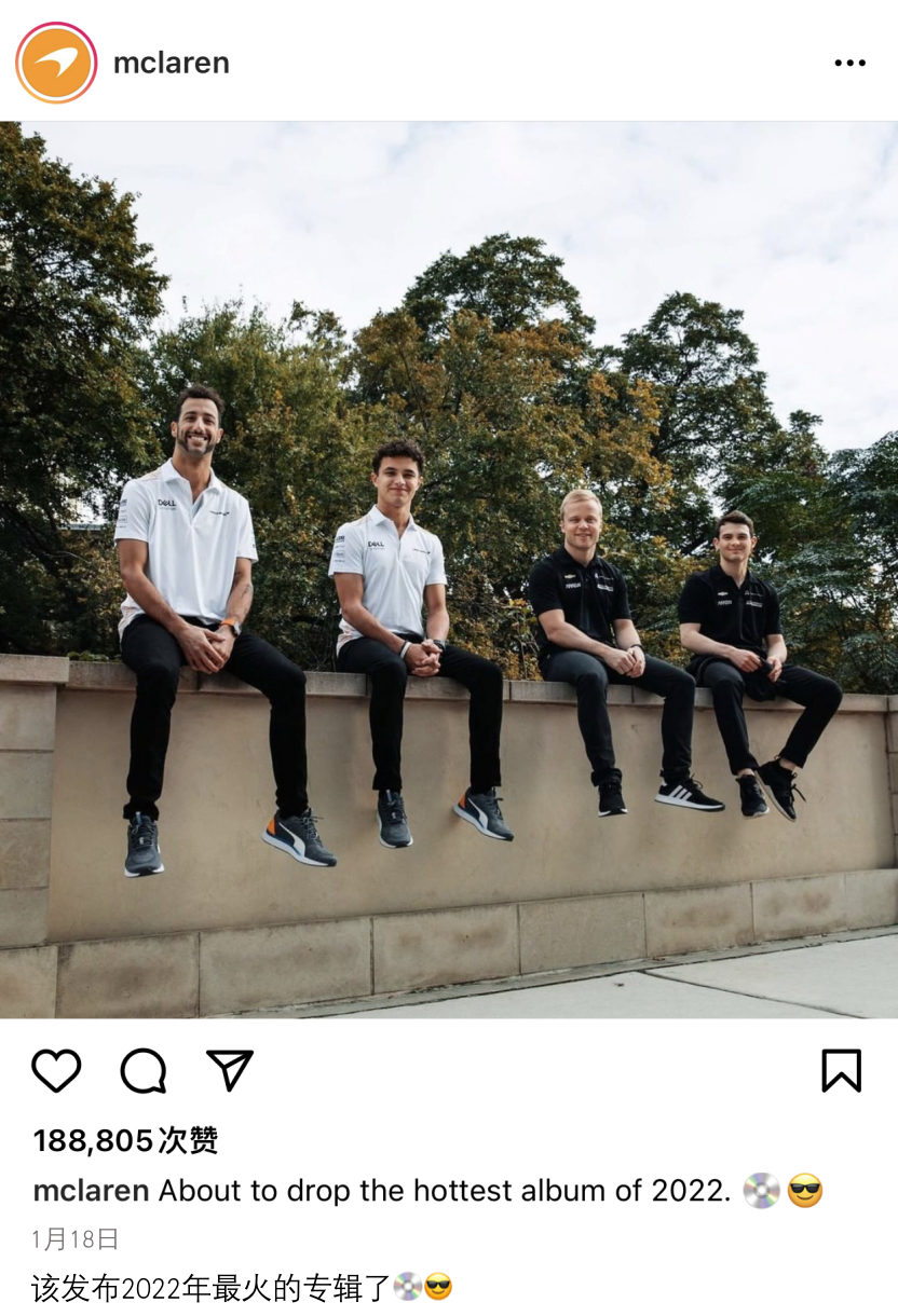 迈凯伦官方发布了车队2022赛季F1和印地赛车的车手合照。四名车手分别是里卡多、诺里斯、罗森奎斯特和欧沃德(从左至右)。