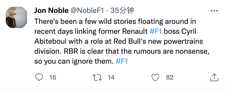 近日,有许多传闻称前雷诺领队西里尔·阿比特波尔可能要加入红牛,担任动力主管。但是根据BBC记者Jon Noble的消息,红牛已经澄清了这一传闻,并说:“这是无稽之谈。”