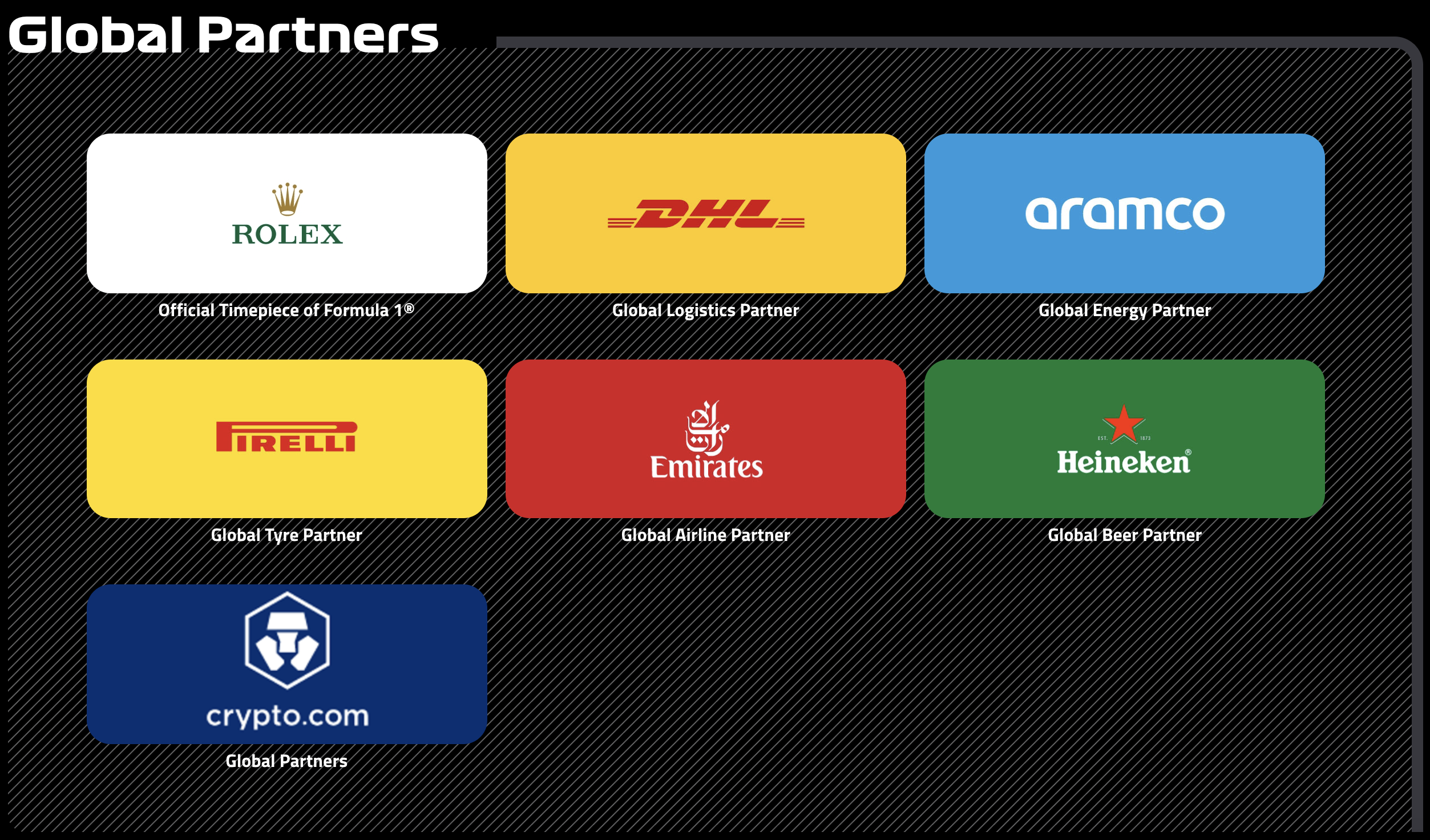 此外,F1还有相当一部分收入来自于赞助商及合作伙伴。F1当前拥有四大赞助收入体系,包括全球合作伙伴、官方合作伙伴、区域合作伙伴以及官方供应商。其中等级最高的“全球合作伙伴”有7家,包括沙特阿美石油、数字货币Crypto.com、DHL、阿联酋航空、喜力、倍耐力和劳力士,其中喜力和劳力士的赞助总额都超过了3亿美元。这些全球合作伙伴每年都有部分场次作为大奖赛的冠名赞助商,并且在大奖赛的场边广告、官方周边、市场活动及社交媒体上得到宣传。