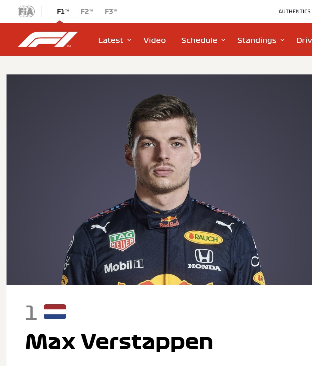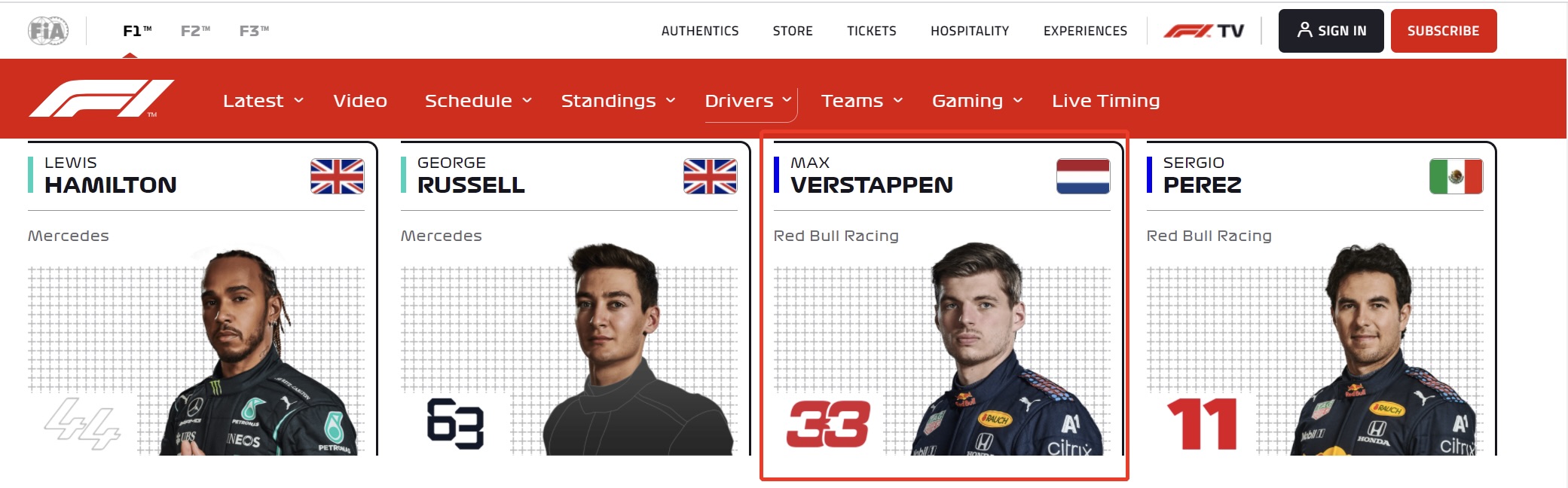 网友发现,F1官网已经把维斯塔潘个人主页的车手号码改为1号,但在车手预览的界面,他的车手号码却还是33号。