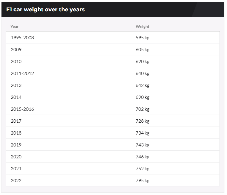 在新修订的技术法规中,F1赛车的最小重量将升至795公斤,与2021赛季(752公斤)相比增加了近50公斤。就在10年前,也就是2008年,赛车仅重595公斤,比现在轻了200公斤。
