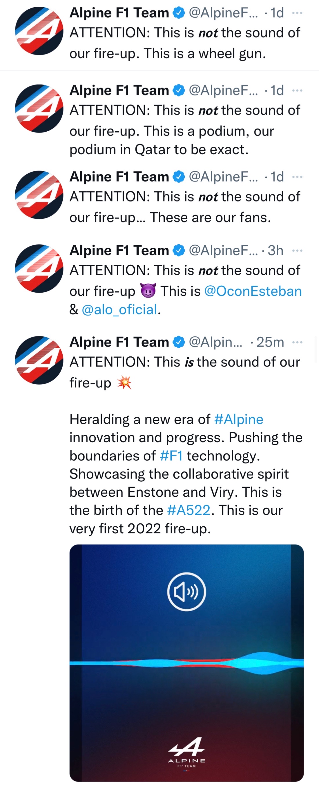 Alpine车队在社交媒体上放出一段新车点火的音频。截止目前,车队还未公布新车发布的时间。