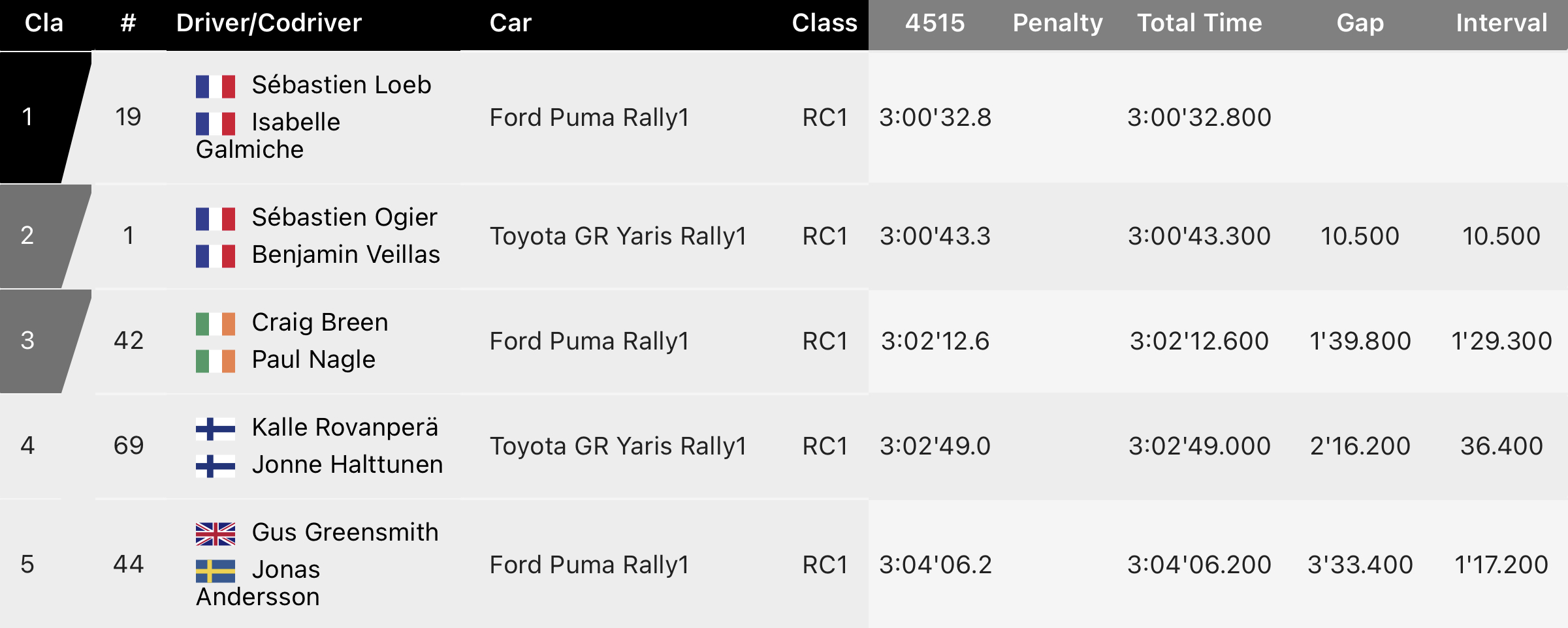 继昨天比赛中取得领先后,奥吉尔开局顺风顺水,两个赛段后和勒布的差距已经达到24.6秒。然而,在今天第三个赛段中奥吉尔左前轮爆胎,使八冠王的领先优势瞬间化为泡影。