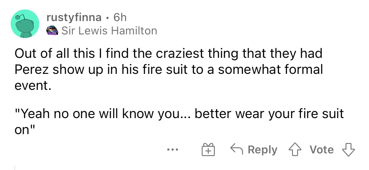“最恐怖的事是,他们居然让佩雷兹穿车手防火服出席了正式晚会。”