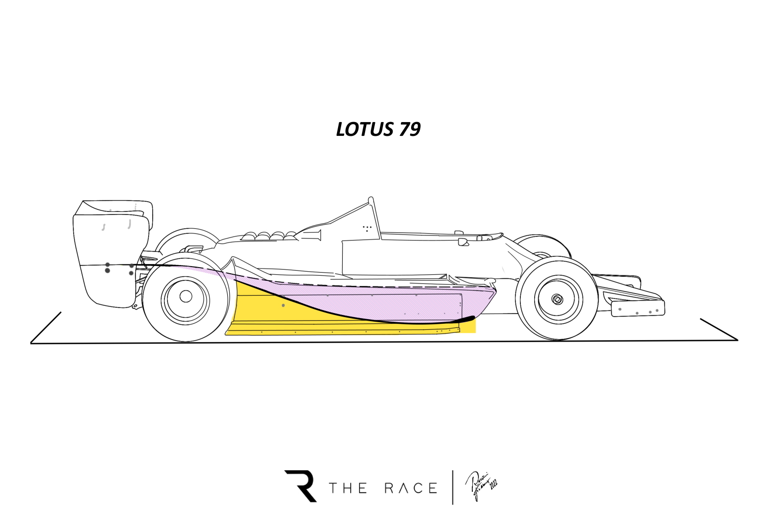 在1977-1982年,这些赛车有更长的侧舱,底盘前端在离前轮不远。底板的最低点,当时被称为“咽喉”,也更靠前,可能在当前赛车方向盘的位置。这种设计让底板的面积足够大,负担了大部分下压力的产生。这让那些使用非常小的前翼,甚至在某些赛事中不使用前翼的车队证实了底板能够产生足够下压力。