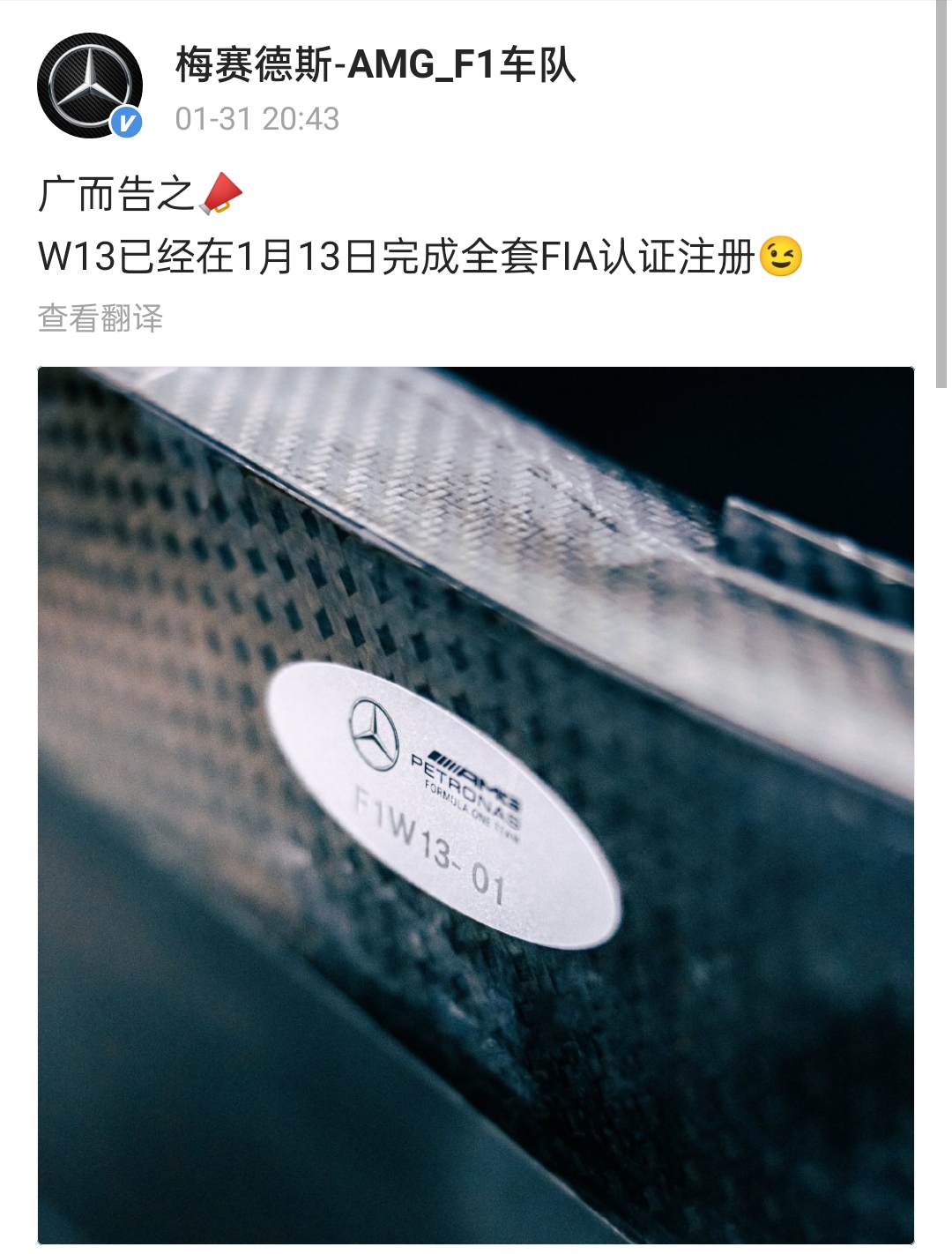 梅赛德斯官方宣布,新车W13在1月13日已经完成了FIA全套认证注册。
