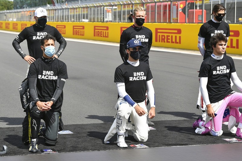 2020年此活动刚刚实施时,哈斯车手马格努森也是跪着参加活动的,而到了英国站时,他却变成站着参加。