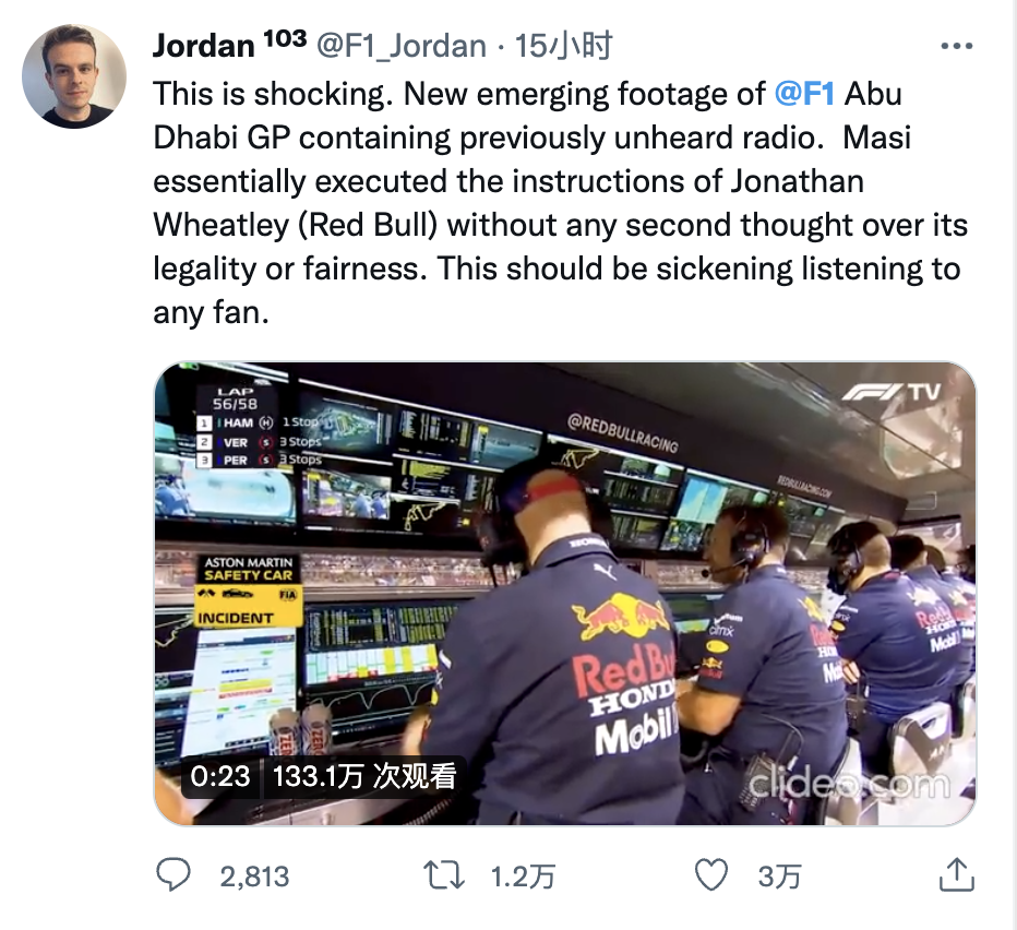 今天,关于迈克尔·马西在做出2021阿布扎比站争议性判罚时与车队领队的语音沟通引发了新一轮的网络争议。FIA的发言人表示对这段视频内容知情。