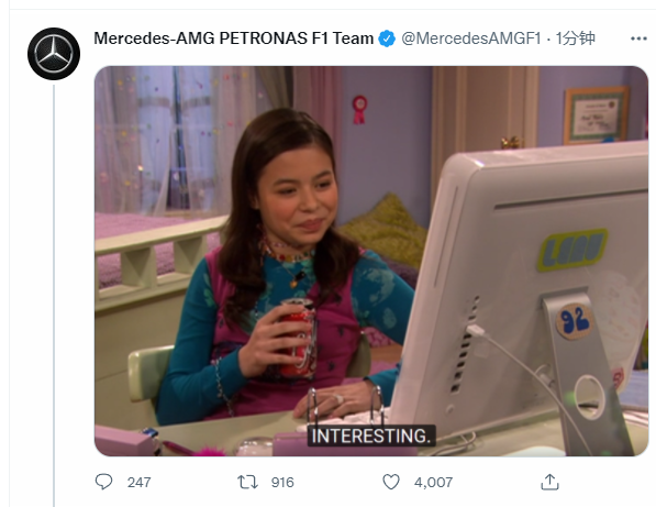 红牛正在视频发布新车,梅赛德斯推特:有意思。