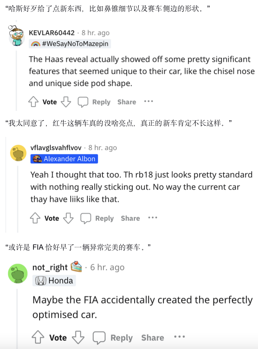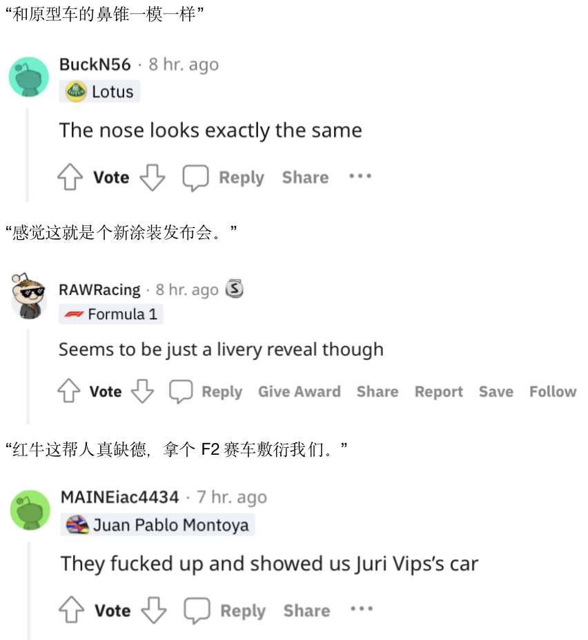 然而,等到新车揭幕时,网友却感到惊讶:红牛领队和车手身旁这辆所谓的新车,跟F1官方发布的原型车也太像了。
