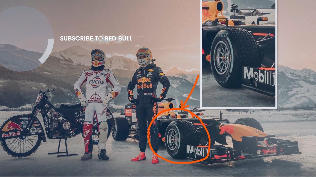 视频静态拍照最后,如果你是柯南你会发现最后拍照F1上是全雨胎魔改钉子版的所谓“Sottozero”,应该是红牛学聪明了,各种轮胎都准备好,毕竟环境险恶,万一不好使换成防滑链就没那么好玩了。还有,这样的宽胎,配上胎壁的大LOGO,确实拍照好看点。