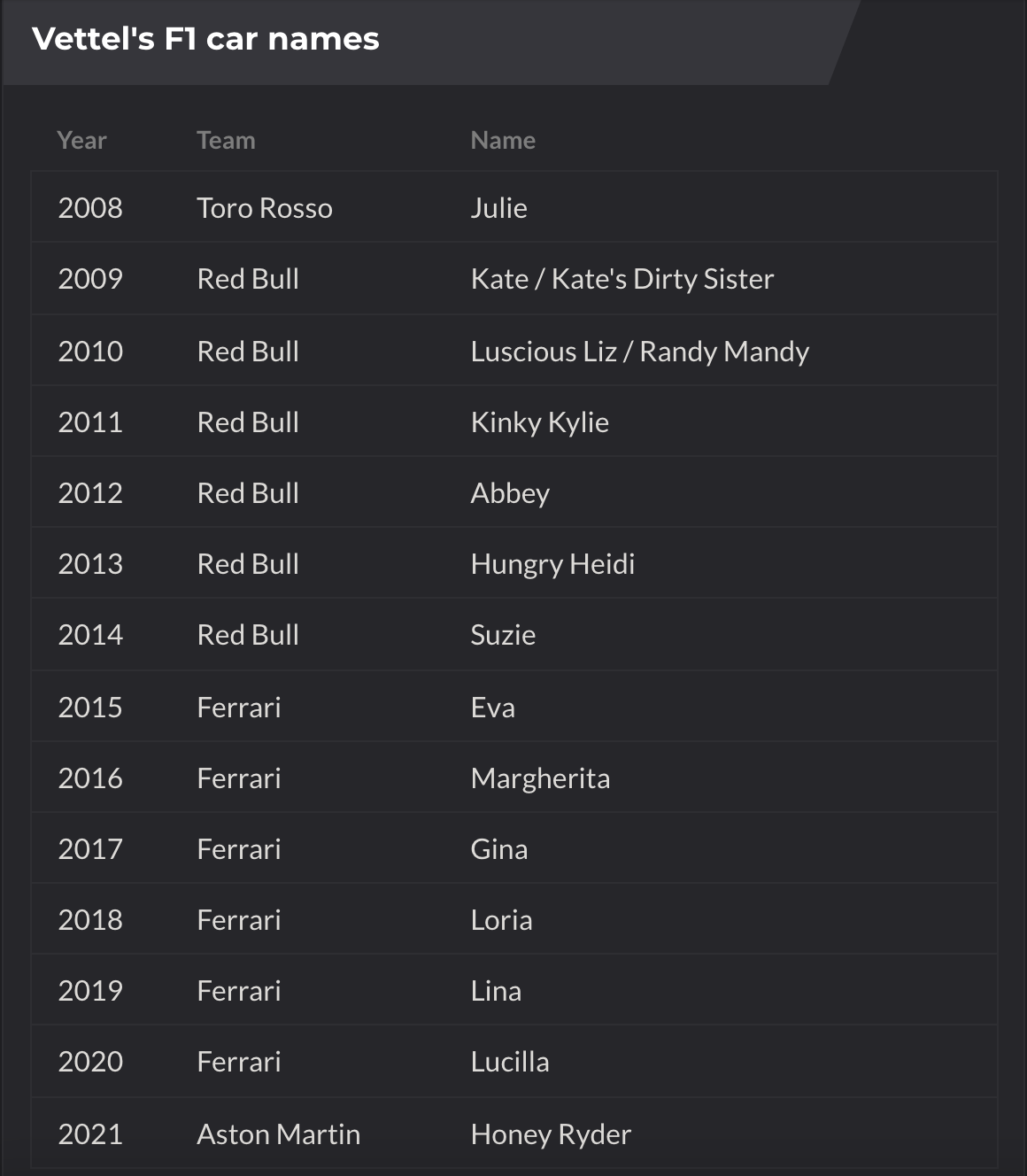 F1车手维特尔的一个特色习惯就是,他会以女性的名字给自己的每一辆赛车命名。这个习惯从他进入F1开始一直保留至今。