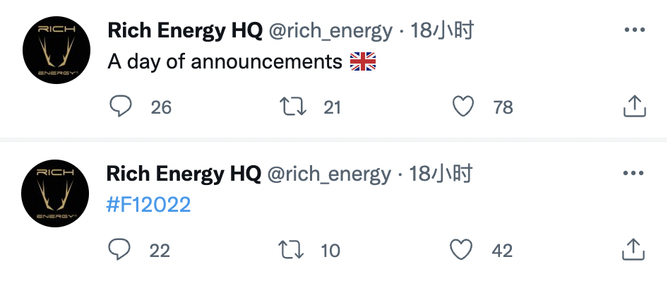 昨日,在迈凯伦车队2022年新车发布会之前,Rich Energy再度发推,表示“今天是官宣的日子”,后面带着英国国旗(迈凯伦是英国车队),并且还带上了F1的标签。