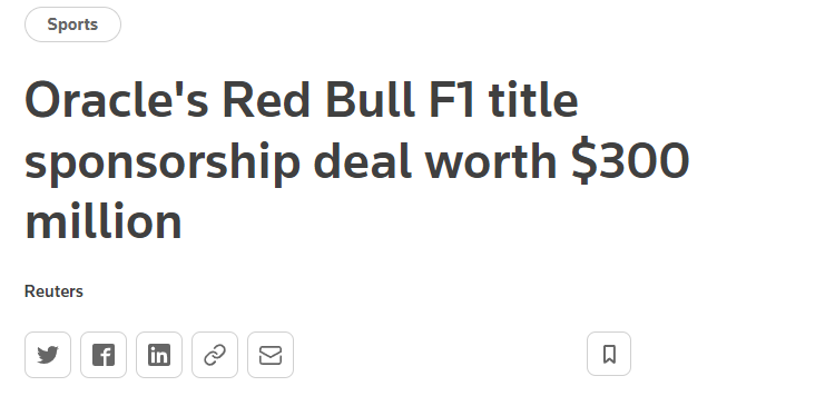 此前,美联社的消息称,甲骨文冠名红牛车队的金额为5年5亿美元。但今天路透社发文称这项赞助为5年3亿美元。