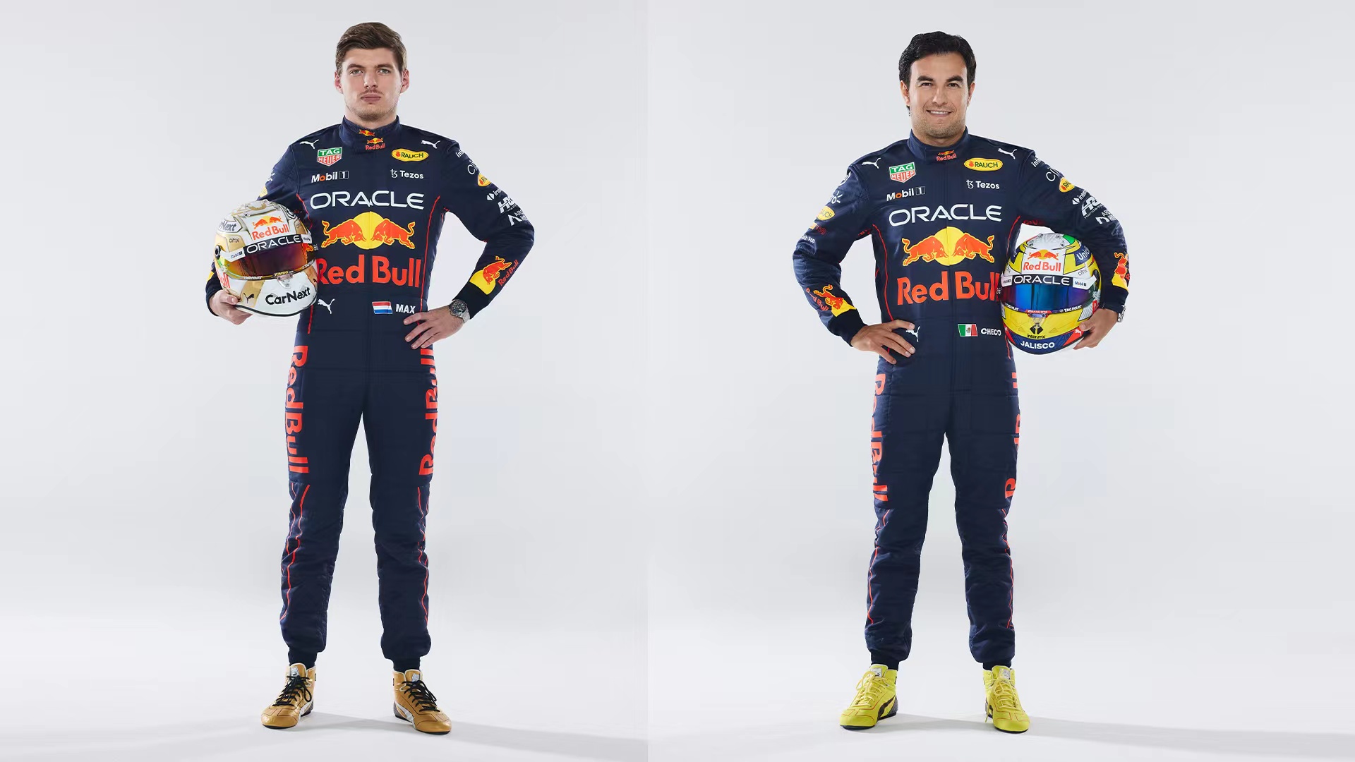 红牛官推发布维斯塔潘和佩雷兹新赛季定妆照,冠名赞助商Oracle清晰可见。