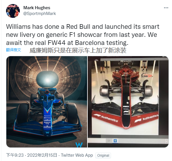 BBC记者:看起来是威廉姆斯的新涂装,不是2022新车。