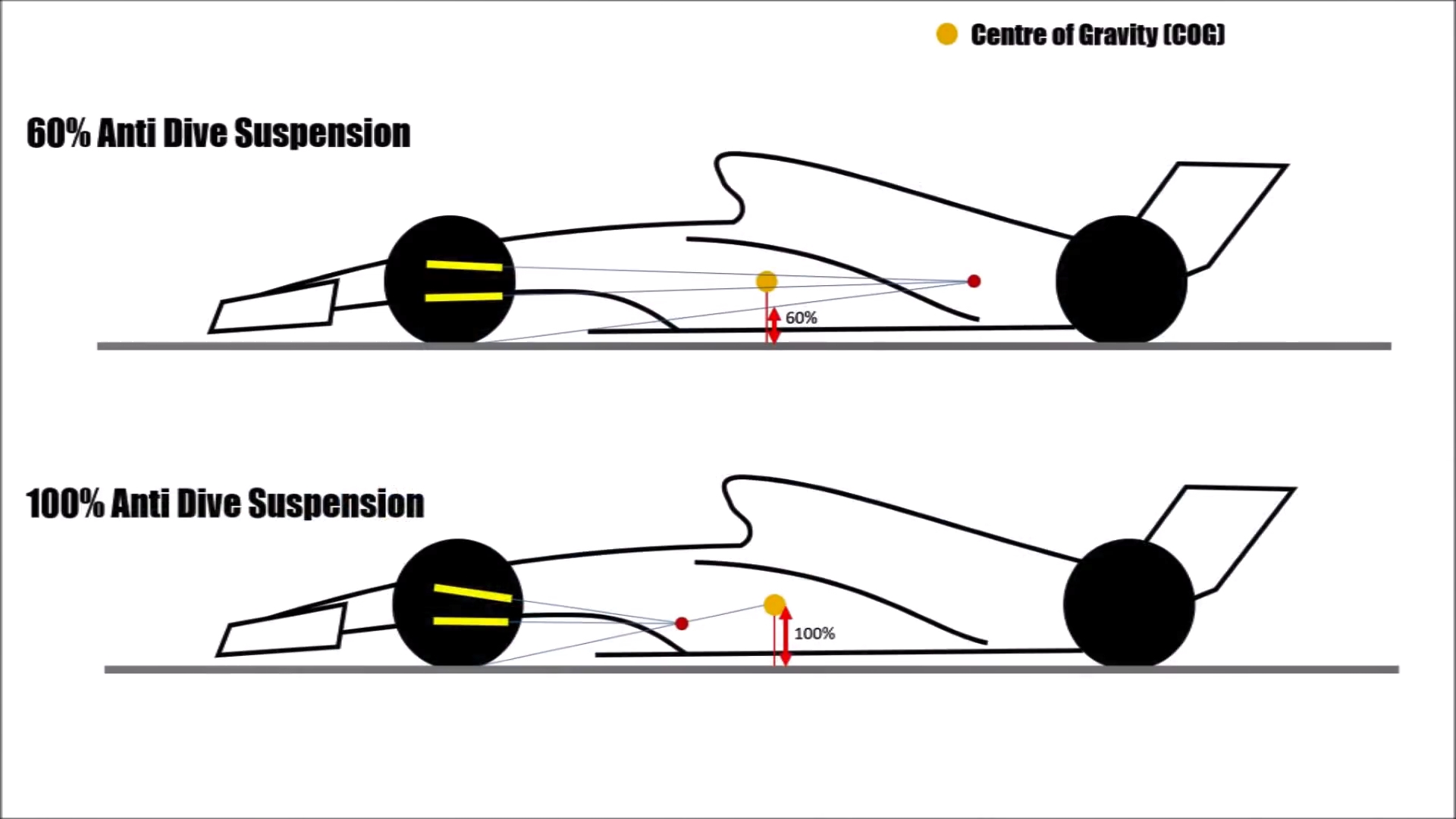 你再仔细看下他的悬挂,前方悬挂连接点高,后方低,这是一个典型的抗俯(Anti-Dive)的悬挂设计。