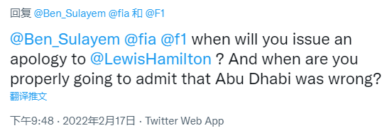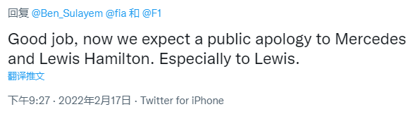 还有车迷问:主席和马西什么时候向汉密尔顿道歉?冠军应该归还给汉密尔顿!