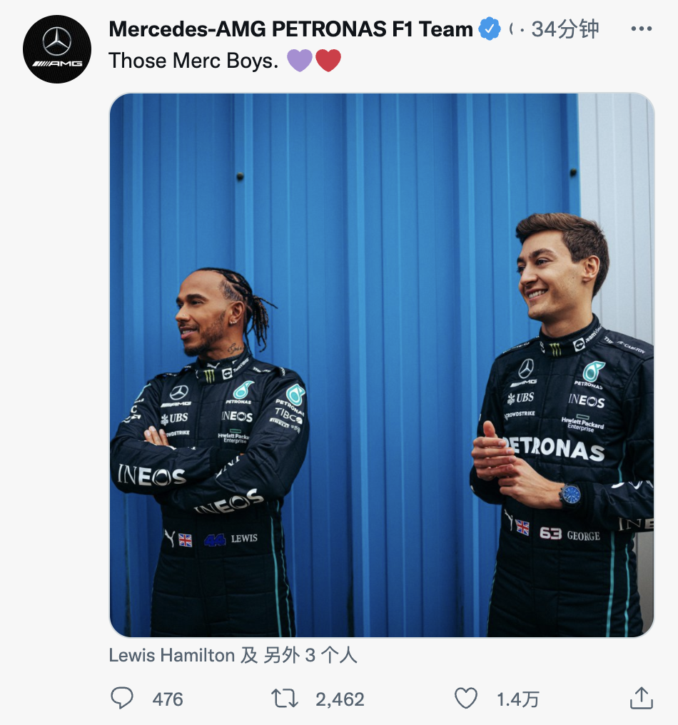梅赛德斯再次发布汉密尔顿和拉塞尔在工厂的照片,两位车手看上去都很开心。