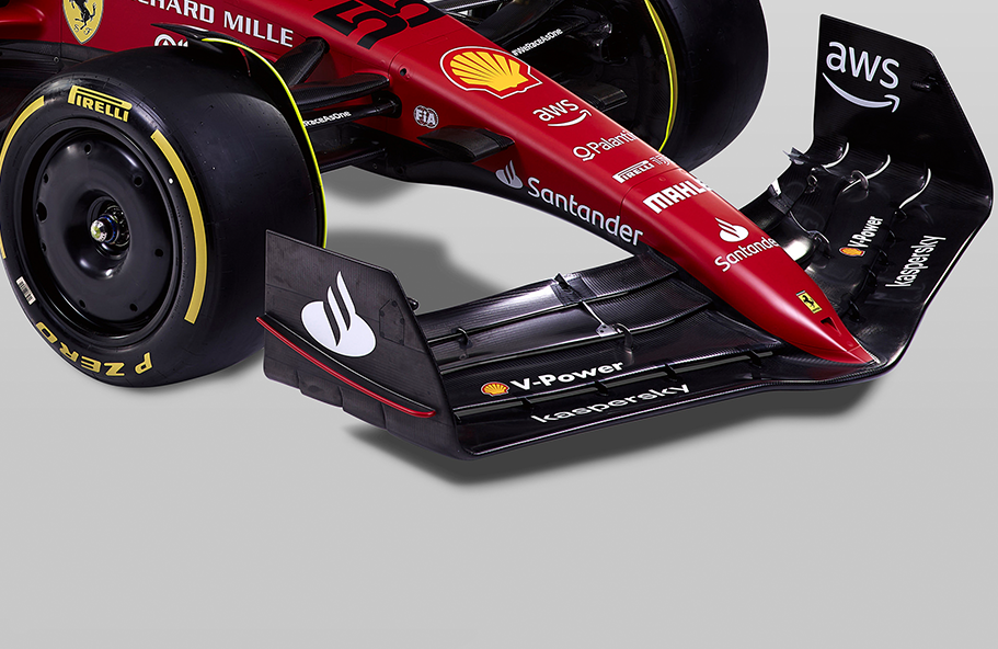 鼻锥与前翼的底层和第二层连接处进行固定,第三层和第四层翼片的走势逐渐向上延展。安德森认为,法拉利的前翼重点部分集中在中间的区域,也就是重点能获取下压力的部分。前翼末端的设计是将气流快速向轮胎外侧导出,同样前翼两端竖起的翼片也帮助赛车更好地引导气流的走势。